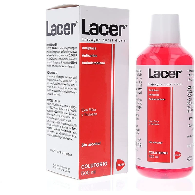 El Colutorio Lacer es un enjuague de uso diario sin alcohol que previene la caries dental. Llega a zonas que son difíciles de limpiar sólo con el cepillado. Su completa fórmula lleva un antiséptico, el triclosán, que actúa contra los microorganismos en la boca y no tiñe los dientes. Su combinación con el Cloruro de Zinc favorece la reducción de la placa bacteriana y cuida las encías. Contiene también flúor que refuerza el esmalte dental y protege frente a la caries.