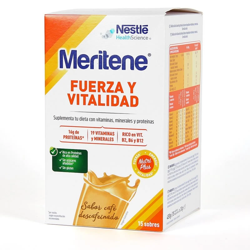 Meritene® Fuerza y Vitalidad es una solución nutricional en formato polvo para diluir y obtener un delicioso batido. Dispones de 4 sabores. Su fórmula NutriPlus contiene proteínas de alta calidad, 19 minerals y vitaminas (entre las cuales se encuentran la vitamina B2, vitamina B6, vitamina B12, vitamina C). Los ingredientes de este batido soluble permiten suplementar la dieta, contribuyendo a disminuir el cansancio y la fatiga y al funcionamiento normal del sistema inmune.