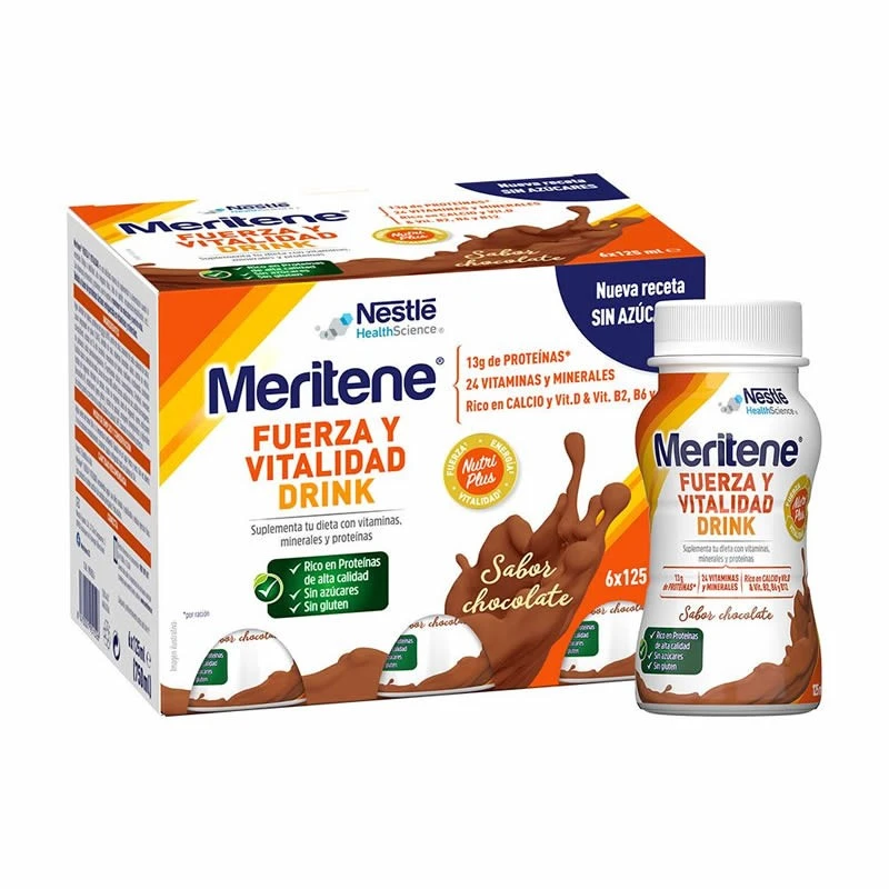 Meritene Fuerza y Vitalidad es una solución nutricional en formato bebible listo para tomar. El batido de chocolate se elabora con la fórmula NutriPlus que contiene proteínas, de alta calidad, vitaminas y minerales. Los ingredientes de Meritene® Fuerza y Vitalidad Chocolate permiten suplementar la dieta, contribuyen a disminuir el cansancio y la fatiga y al funcionamiento normal del sistema inmune.