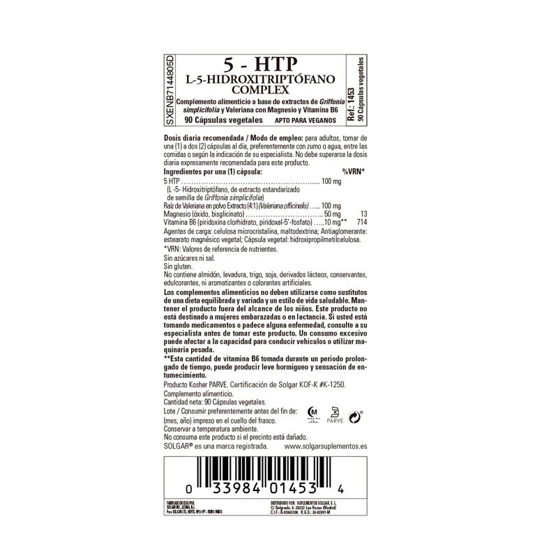 Los 100 mg de 5-HTP por cápsula se combinan con vitamina B6, que contribuye a reducir el cansancio y la fatiga. Incluye además valeriana, utilizada tradicionalmente por sus propiedades calmantes. Solgar® 5-HTP L-5-Hidroxitriptófano Complex Cápsulas vegetales son aptas para veganos y no contienen soja, lácteos ni gluten.