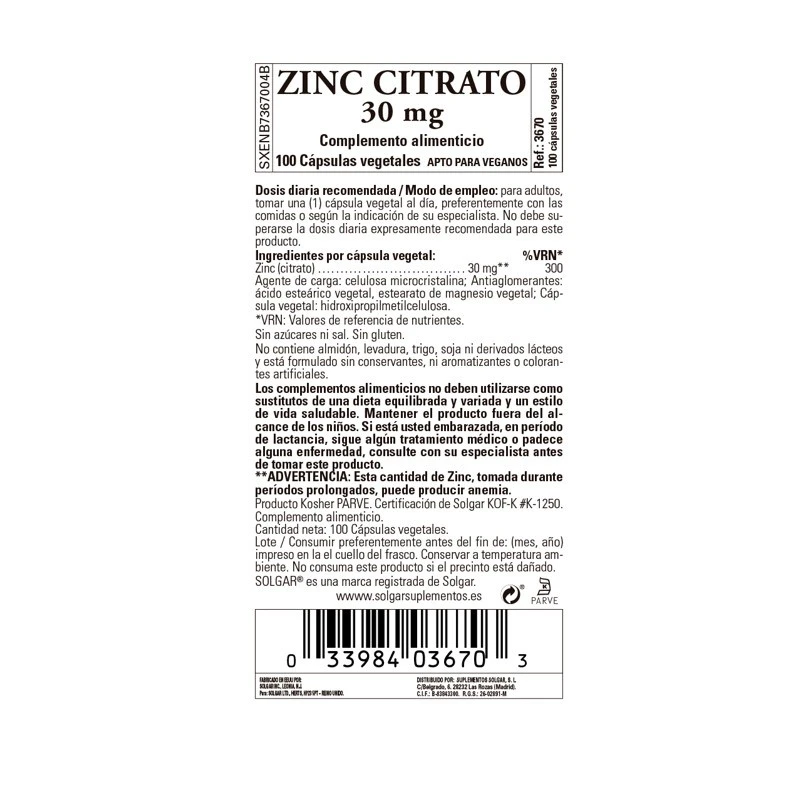 Zinc (citrato). Agente de carga: celulosa microcristalina; Antiaglomerantes: ácido esteárico vegetal, estearato de magnesio vegetal; Cápsula vegetal: hidroxipropilmetilcelulosa.