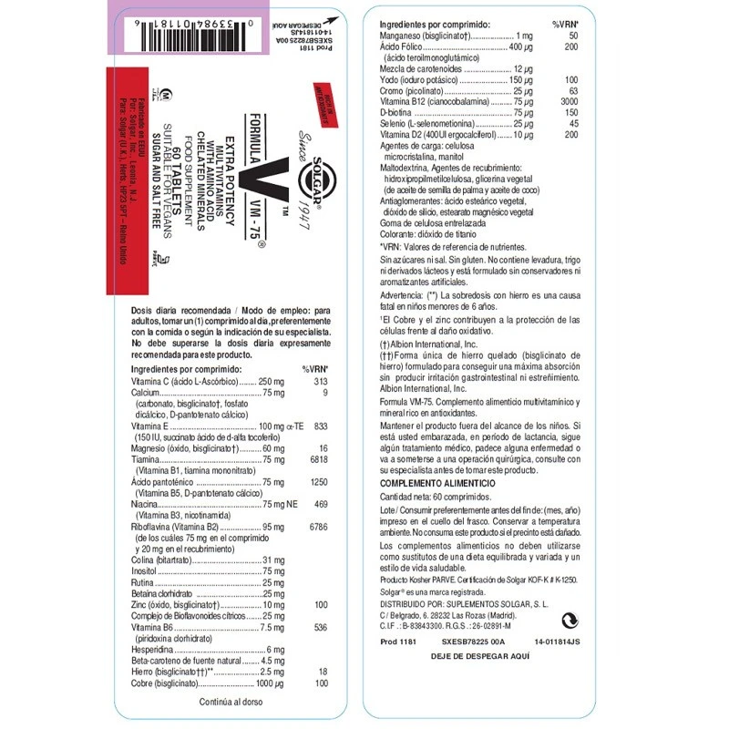 Vitamina C (ácido L-Ascórbico), Vitamina E (150UI, succinato ácido D-alfa de tocoferilo), Riboflavina (Vitamina B2), Vitamina B6 (clorhidrato de piridoxina), Tiamina (Vitamina B1, tiamina mononitrato), Ácido pantoténico (Vitamina B5, D-pantotenato cálcico), Niacina (Vitamina B3, nicotinamida), Inositol, Calcio (carbonato, bisglicinato, D-pantotenato), Rutina en polvo, Magnesio (óxido, bisglicinato), Colina (bitartrato), Complejo Bioflavonoide cítrico en polvo, Betaina clorhidrato, Zinc (óxido, bisglicinato), Hesperidina complex, Beta-caroteno de fuente natural, Base herbaria pulverizada (Alfalfa (Medicago sativa) (hoja y tallo), Acerola (Malpighia glabra) (Extracto de fruto), Perejil (Petroselinum crispum) (hoja y tallo), Berro (Nasturtium officinale) (hoja), Escaramujo (Rosa canina) (fruto), Hierro (bisglicinato), Manganeso (bisglicinato), Cobre (bisglicinato), Boro (ácido bórico), Ácido Fólico (ácido teroilmonoglutámico), Yodo (kelp pulverizado), Vitamina B12 (cianocobalamina), D-biotina, Selenio (L-selenometionina), Cromo (picolinato), Mezcla de carotenoides, Vitamina D2 (400 UI). Agentes de carga: celulosa microcristalina, alginato, maltodextrina, almidón de guisante, hidroxipropilmetilcelulosa, fosfato dicálcico, manitol, ácido cítrico; Antiaglomerantes: estearato magnésico vegetal, dióxido de silicio, ácido esteárico vegetal; Colorante: dióxido de titanio; Agentes de recubrimiento: hidroxipropilmetilcelulosa, glicerina vegetal (de aceite de semilla de palma y aceite de coco); Goma de celulosa..
