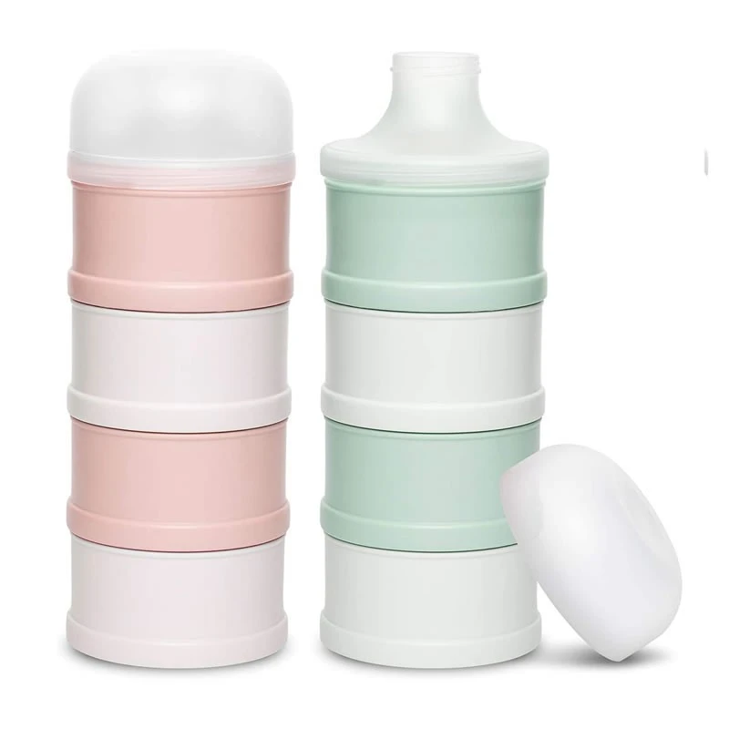 Contiene 4 compartimentos independientes apilables e intercambiables cada uno de un color diferente para organizar la leche en polvo y cereales.