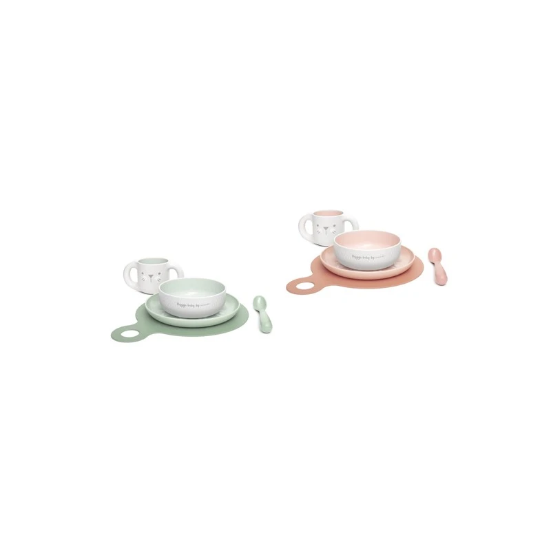 Esta vajilla está compuesta por un plato llano y bol de gran capacidad, una taza con grandes asitas que facilitan su agarre, cuchara ergonómica ideal para papillas y potitos y mantel antideslizante que evita que el plato se mueva.
