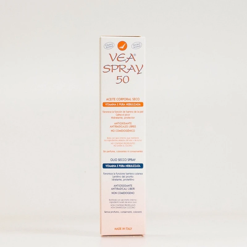 - Vea Spray ofrece la seguridad y la comodidad de la Vitamina E pura nebulizada: monodermodosis (1 rociado = 1 dosis). No engrasa , hidrata en profundidad , calma el picor, fácil de aplicar y hace la piel más elástica. Vea Spray puede ser aplicado sin tocar o frotar la zona de la piel que se desea tratar. No contiene conservantes, perfumes ni colorantes. Hipoalergénico, formulado para minimizar el riesgo de alergias.